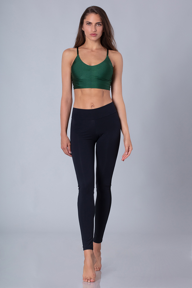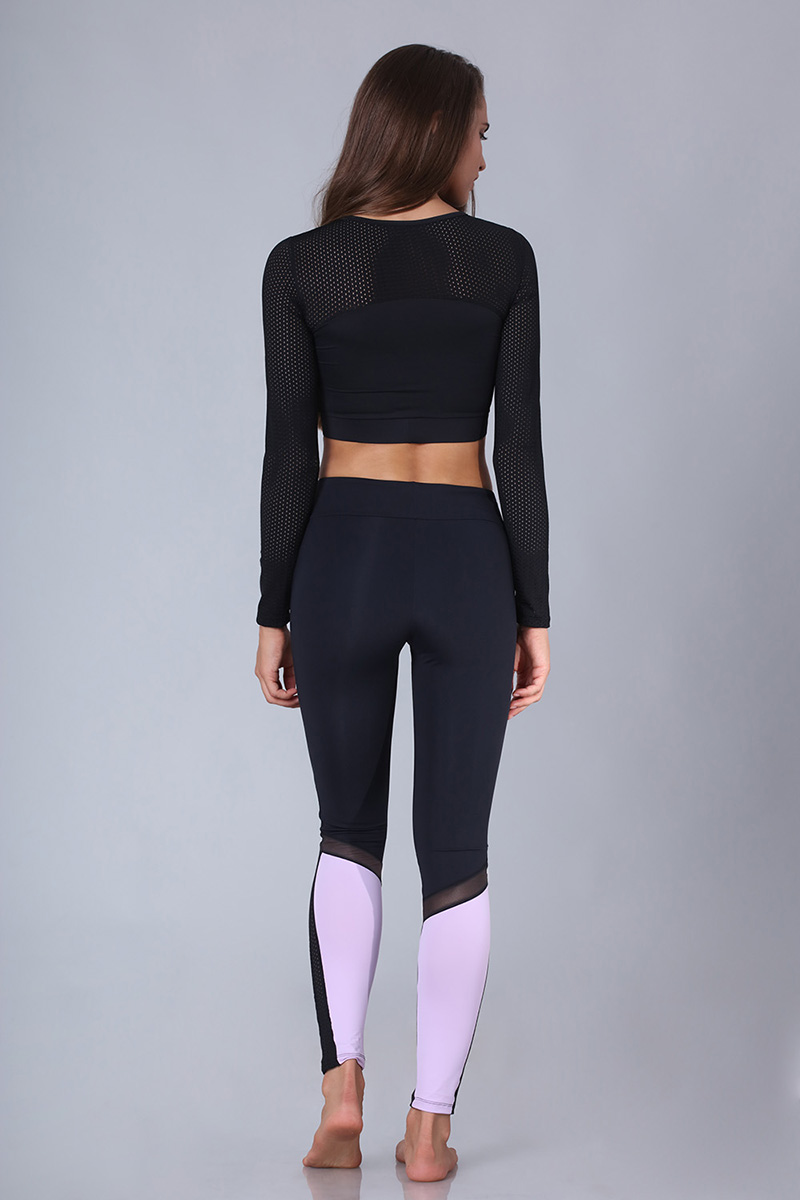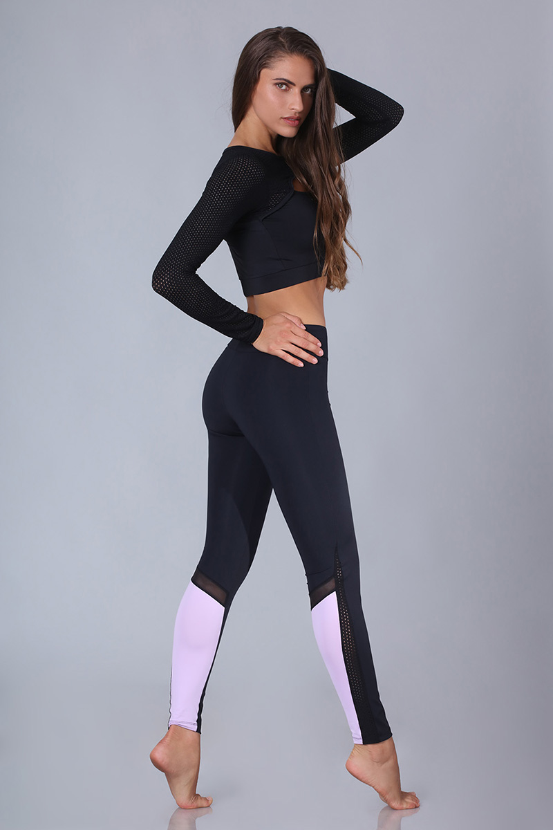 Σπορ μαύρο κολάν με λιλά ή πράσινο σχέδιο στο πίσω μέρος του, λεπτομέρεια από δίχτυ στο πλάι και διαφάνεια στο πίσω μέρος.